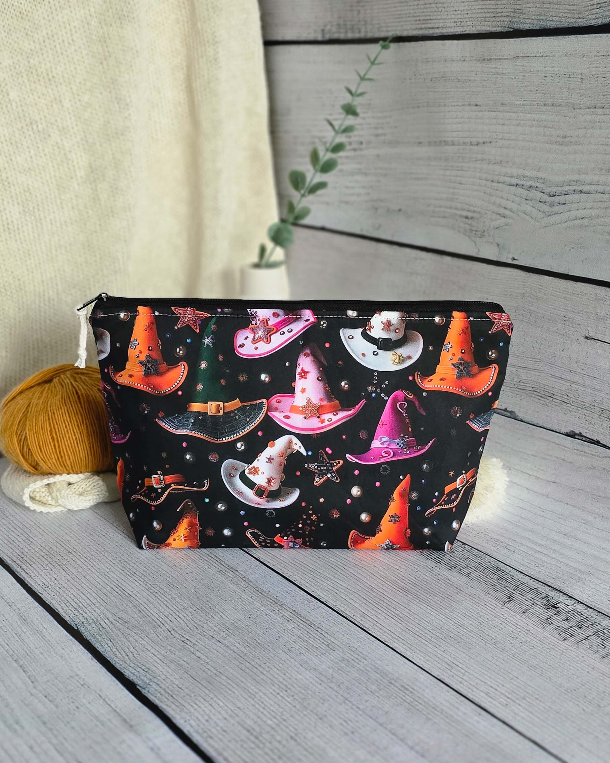 Die Projekttasche „Witch Hats“ verbindet ein verspieltes Halloween-Design mit Funktionalität. Bunte Hexenhüte auf dunklem Hintergrund machen sie zu einem besonderen Accessoire für deine Handarbeit.