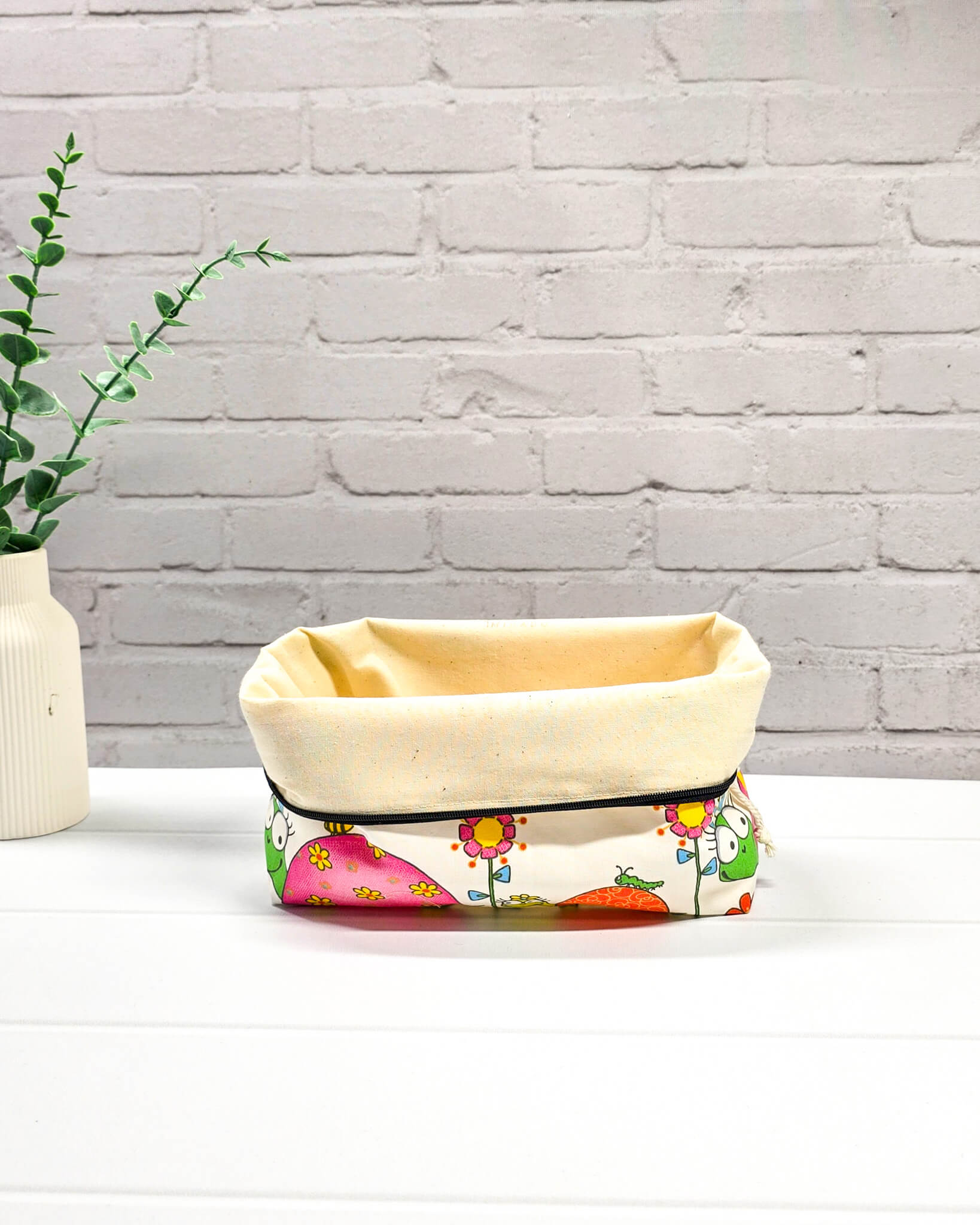 Die Projekttasche ist aus Baumwolle gefertigt und mit einem Volumenvlies stabilisiert, das Form und Schutz bietet. Deine Nadeln, dein Garn und Zubehör bleiben ordentlich verstaut – auch unterwegs.